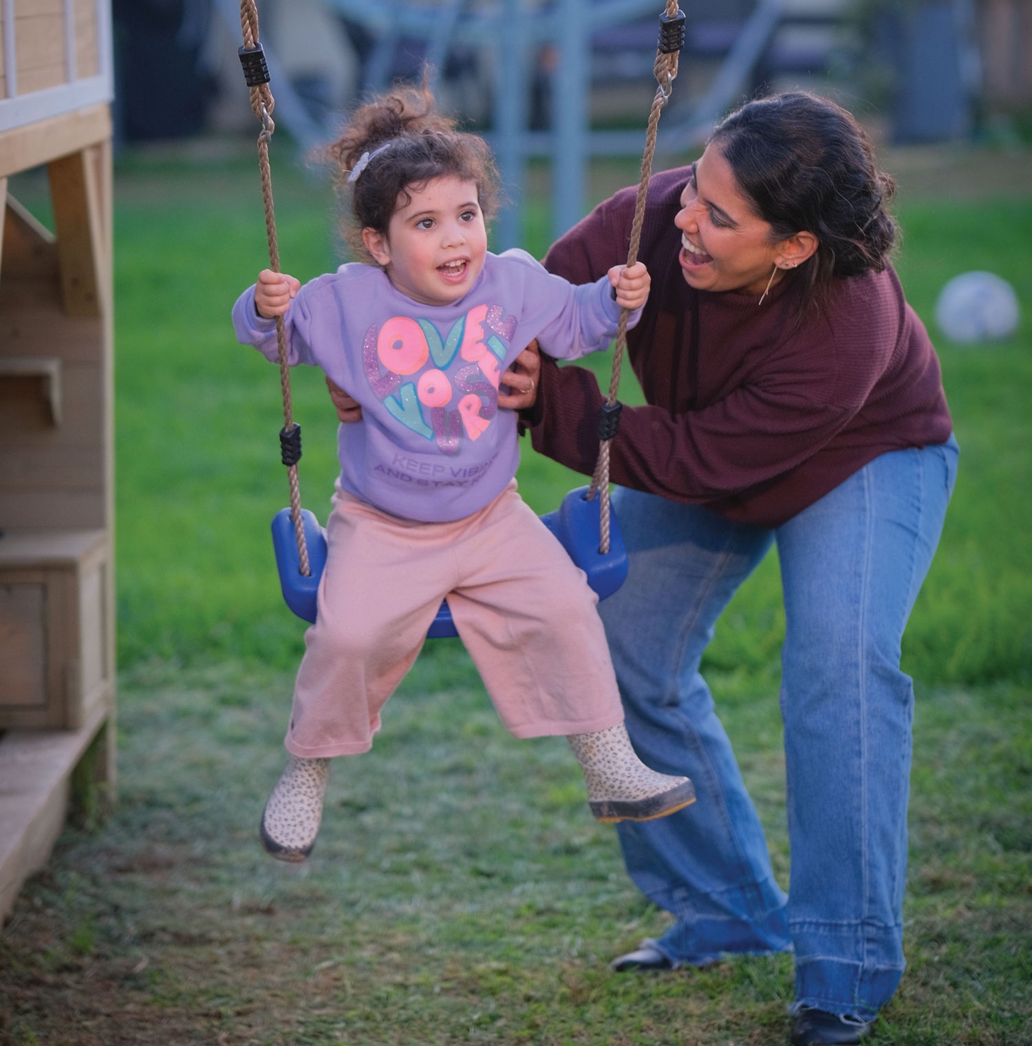 Ellay pushes young Yael on the swings (photo by Virginia Khalifa)While Yael continued to make progress in her therapy sessions, her parents were also rebuilding their lives. Determined to complete her medical training, Ellay resumed her clinical rotations at Sheba Hospital while still undergoing treatment. She completed her internship there in July 2024, and by November of that year, she began her residency as an anesthesiologist at Soroka Medical Center in Be’er Sheva in southern Israel. Ariel, meanwhile, had shifted his focus from his work in mental health to helping rebuild their new community, understanding that collective healing was as important as individual recovery.
